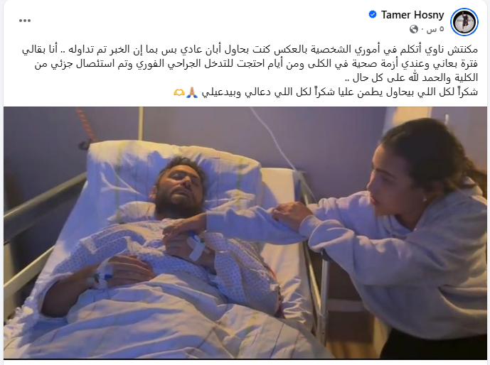 و ذكر الفنان تامر حسني أنه لم يكن يريد ان يخبر أحد عن مرضه و كان يحاول أن يظهر في حالته الطبيعية و لكن حين تداول خبر مرضه قرر أن يشارك جمهوره بوضعه وهو ما ذكره في منشور عبر حسابه الشخصي “أنا بقالي فترة بعاني وعندي أزمة صحية في الكلى ومن أيام احتجت للتدخل الجراحي الفوري وتم استئصال جزئي من الكلية والحمد لله على كل حال .. ”.