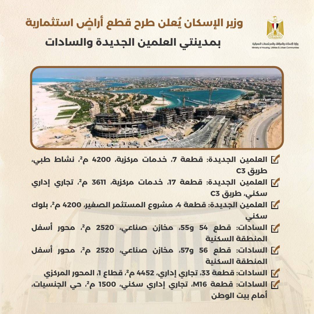أعلن المهندس شريف الشربيني، وزير الإسكان والمرافق والمجتمعات العمرانية، عن طرح مجموعة من قطع الأراضي الاستثمارية المميزة بمدينتي العلمين الجديدة والسادات بنظام البيع لتلبية الاحتياجات المستقبلية، والتي تأتي في إطار خطة هيئة المجتمعات العمرانية الجديدة للتوسع في جذب الاستثمارات المتنوعة ودعم الأنشطة الخدمية والسكنية والطبية بالمدن الجديدة.