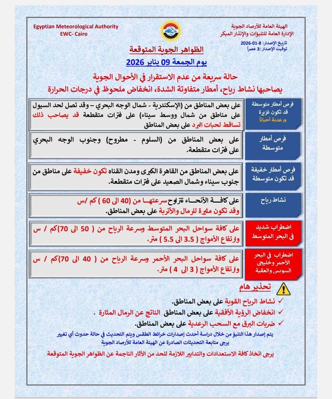 تشهد حالة الطقس غدًا الجمعة 9 يناير 2026، تقلبات جوية سريعة على أغلب أنحاء البلاد، في ظل حالة من عدم الاستقرار الجوي، يصاحبها نشاط للرياح وأمطار متفاوتة الشدة، مع انخفاض ملحوظ في درجات الحرارة.