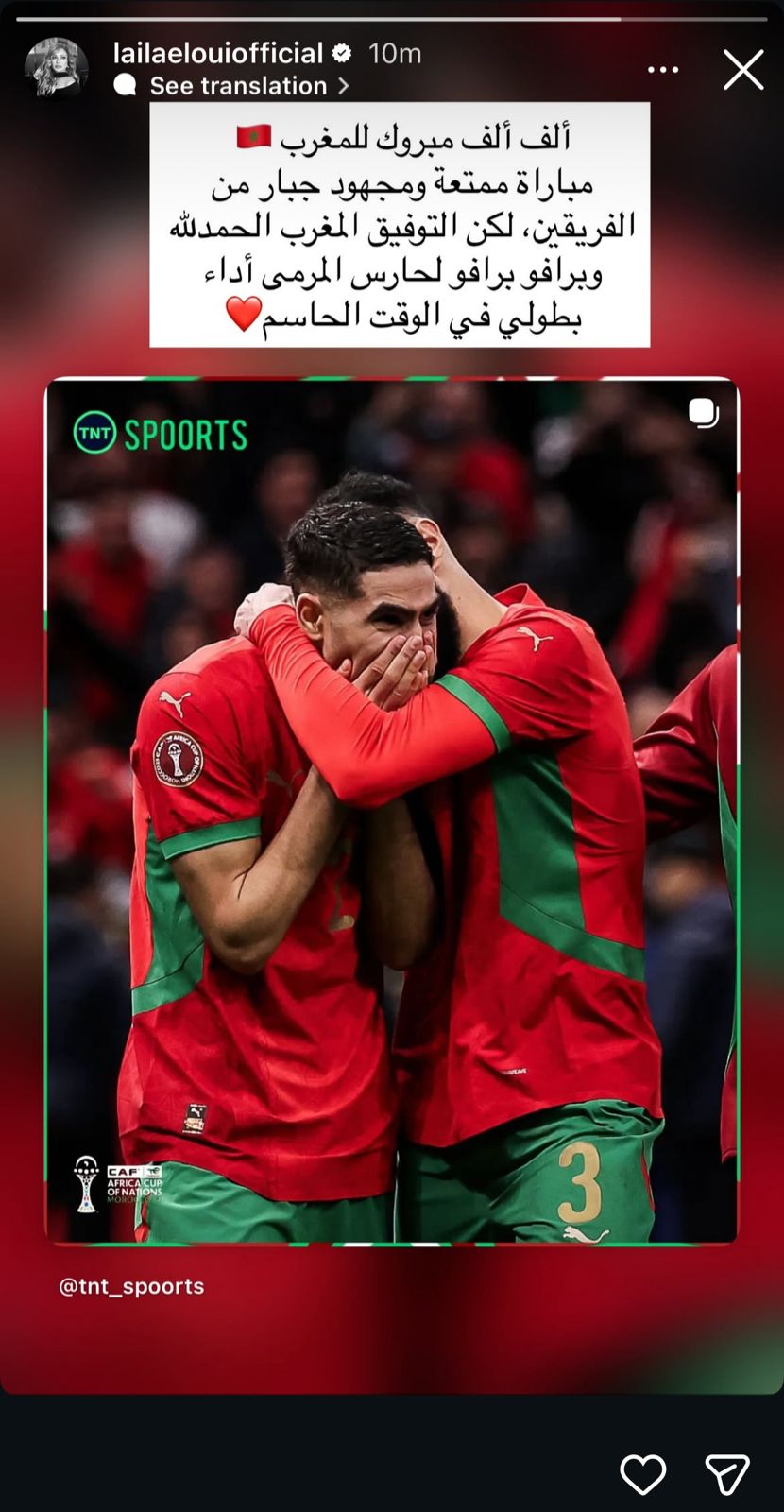 ونشرت ليلى علوي رسالة تهنئة عبر حسابها الرسمي على «إنستجرام»، قالت فيها: «ألف ألف مبروك للمغرب! مباراة ممتعة ومجهود جبار من الفريقين، لكن التوفيق كان حليف المغرب. الحمد لله وبرافو برافو لحارس المرمى على الأداء البطولي في الوقت الحاسم».