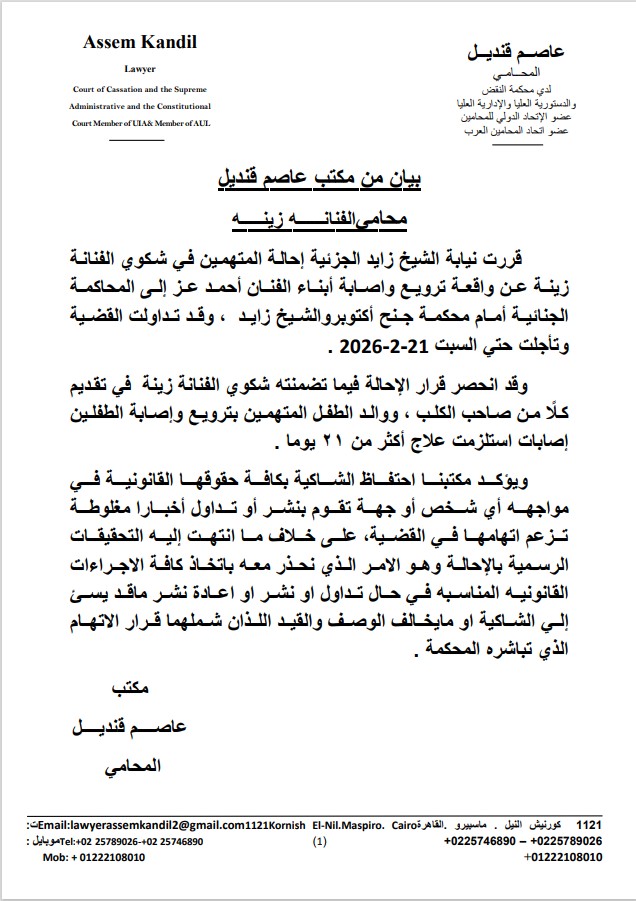 وأوضح البيان أن نيابة الشيخ زايد الجزئية قررت إحالة المتهمين في واقعة التعدي والإصابة المرتبطة بالشكوى المقدمة من الفنانة زينة إلى المحاكمة الجنائية أمام محكمة جنح أكتوبر، على خلفية اتهامات بترويعها والتسبب في إصابات لها، إلى جانب إصابة نجلها من كلب مملوك لأحد المتهمين، وهي الإصابات التي استلزمت العلاج.