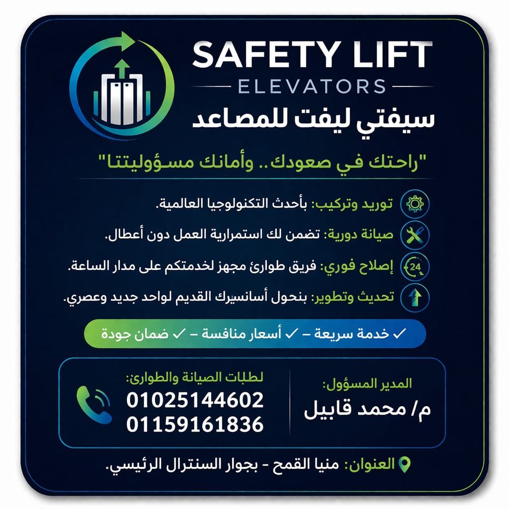 إن اختيار المصعد الصحيح هو استثمار ذكي في العمر الافتراضي للمبنى وفي سلامة قاطنيه، ومع “سيفتي لفت”، يبدو أن المستقبل الصاعد أصبح أكثر أماناً، سلاسة، وذكاءً.