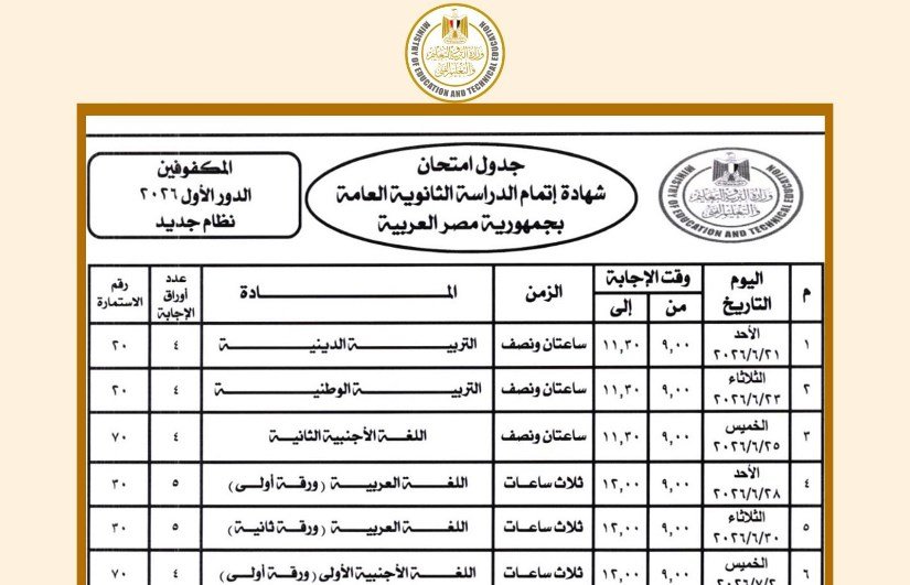 جدول امتحانات الثانوية العامة 2026